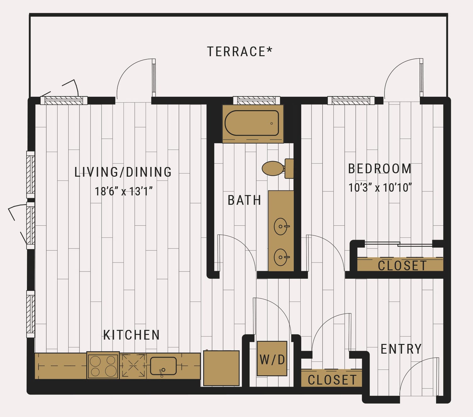 Floorplans are an artist’s rendering and may not be to scale. The landlord makes no representation or warranty as to the actual size of a unit. All square footage and dimensions are approximate, and the actual size of any unit or space may vary in dimension. The rent is not based on actual square footage in the unit and will not be adjusted if the size of the unit differs from the square footage shown. Further, actual product and specifications may vary in dimension or detail. Not all features are available in every unit. Prices and availability are subject to change. Please see a representative for details.